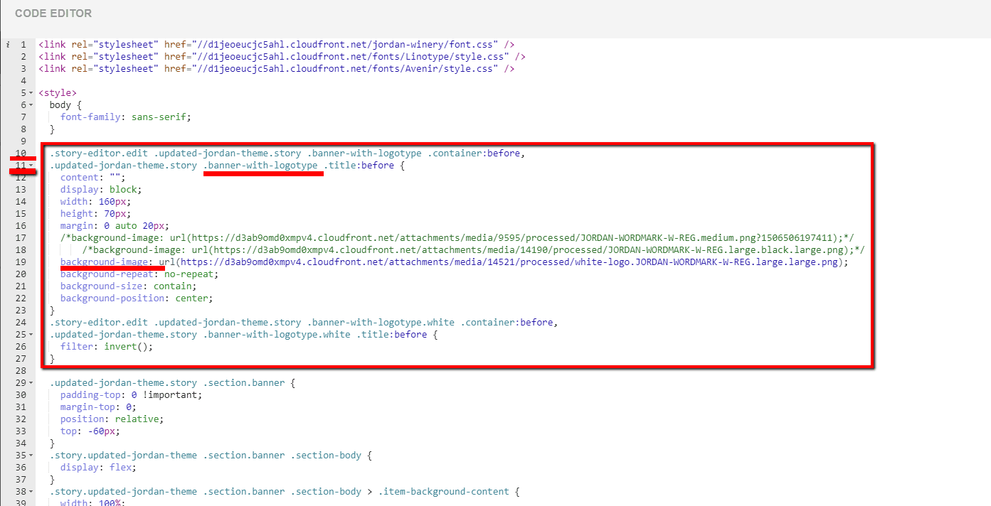 Step 3. In the opened Code Block, navigate to rows 10-11. Notice the class name “.banner-with-logotype”. In the Style rules look for this notation: <b>background-image: url(...)</b>. This is where you can set the logo image for the banner.