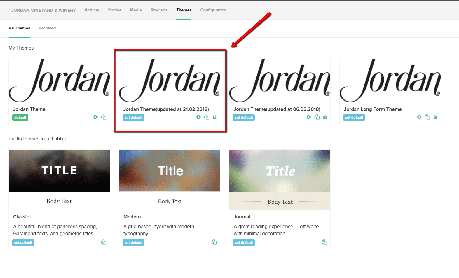 Step 1. Open the Theme (that is set for a particular story). In our example, the theme is “Jordan Theme (updated at 21.02.2018)”.