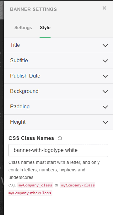 Step 4. Set “.banner-with-logotype” class name to STYLE in the Banner Settings of the story. See below: