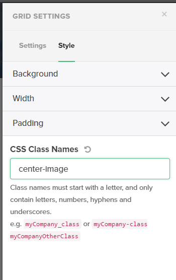 - Will begin with adding CSS CLass Name to the “Grid” element. For example, “center-image”.