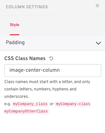 - The next step is to add CSS Class Name to the “Column” element, which contains image. For example, “image-center-column”.