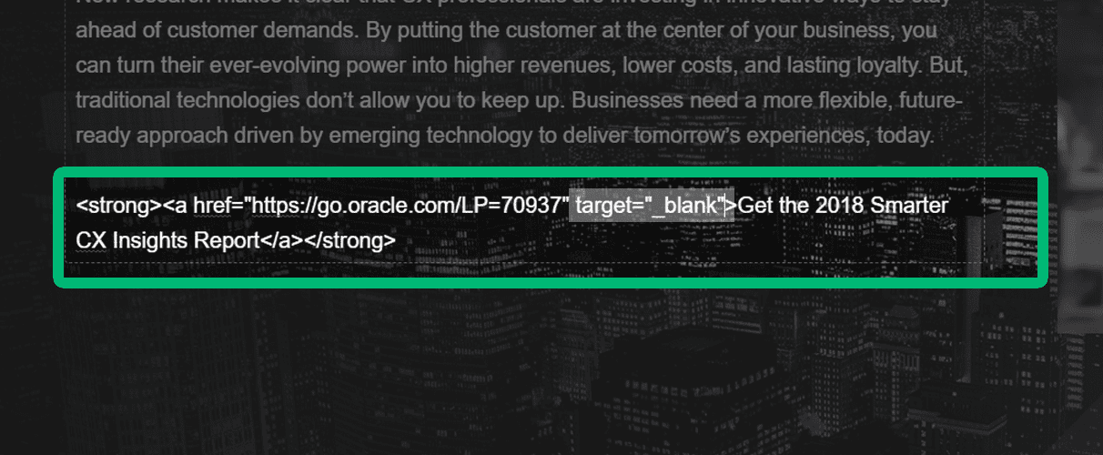 In the example below, the URL “https://go.oracle.com/LP=70937”, which is linked to the phrase “Get the 2018 Smarter CX Insights Report”, will open in a new tab when clicked.